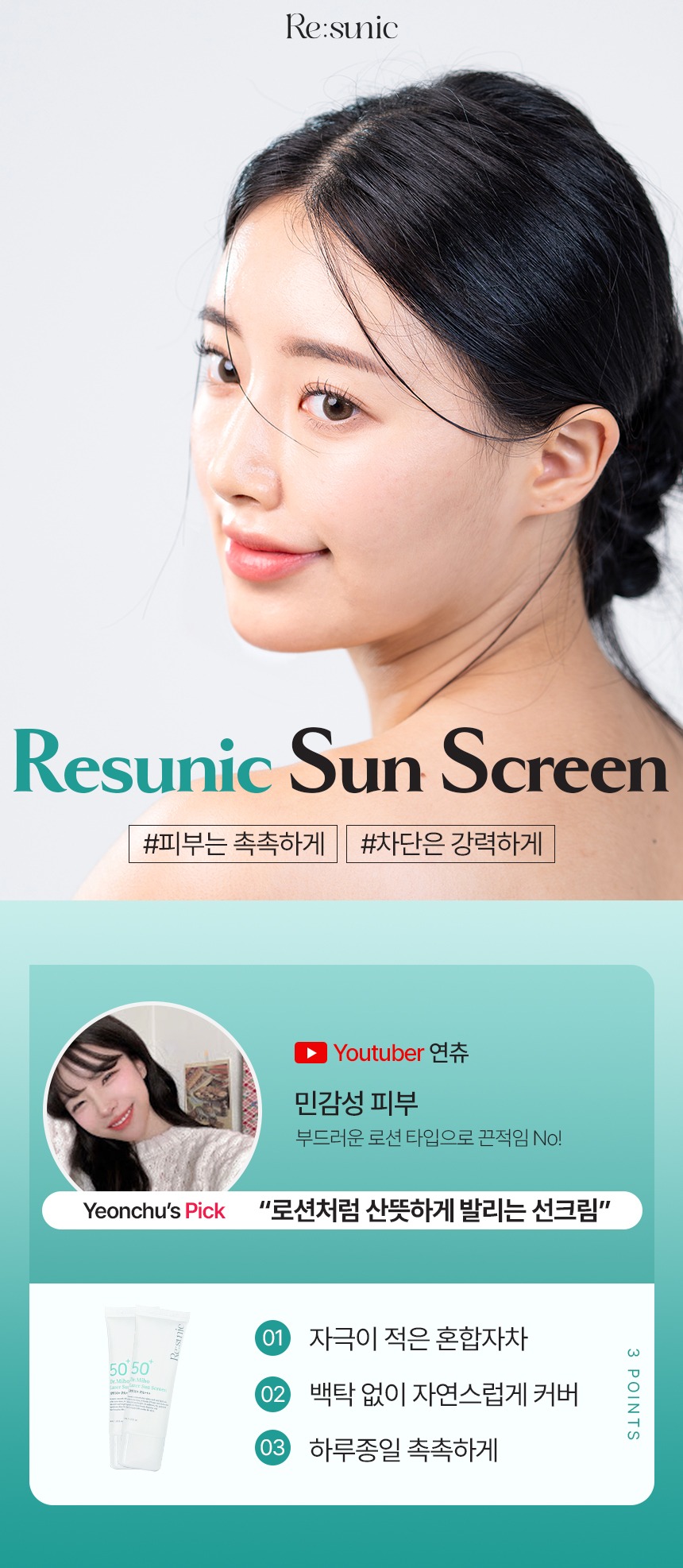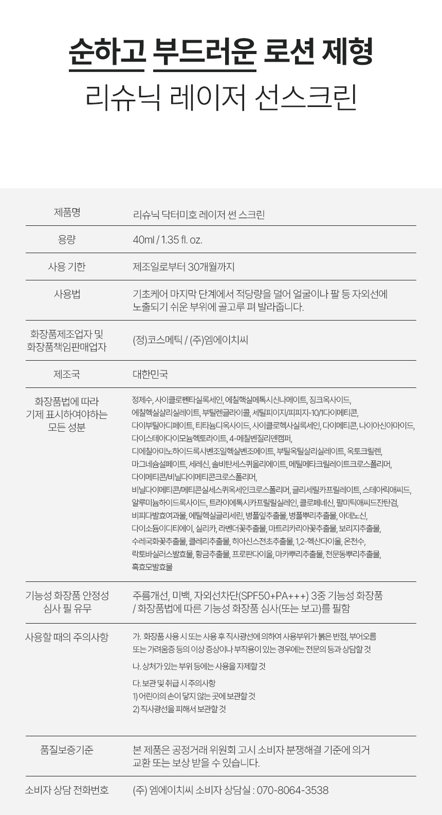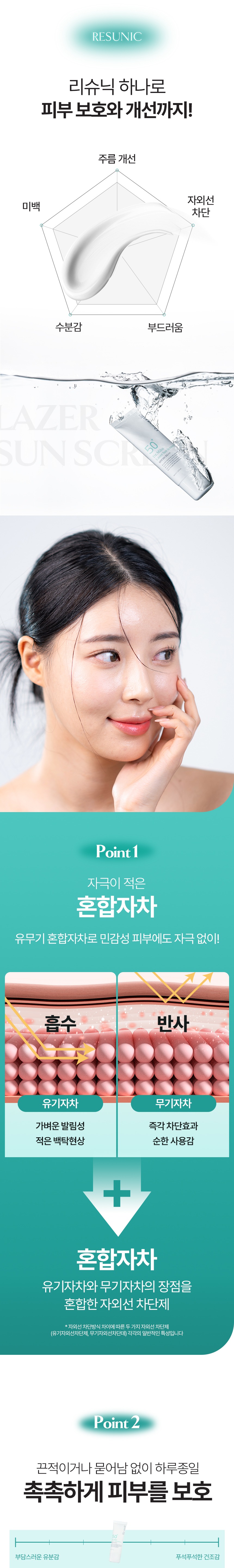 유기자차+무기자차 혼합자차 선크림으로 자극,백탁 없이 부드럽게 자외선으로 부터 피부를 보호합니다.미백/주름개선/자외선차단 3중 기능성으로 자외선 차단과 피부개선을 한 번에!